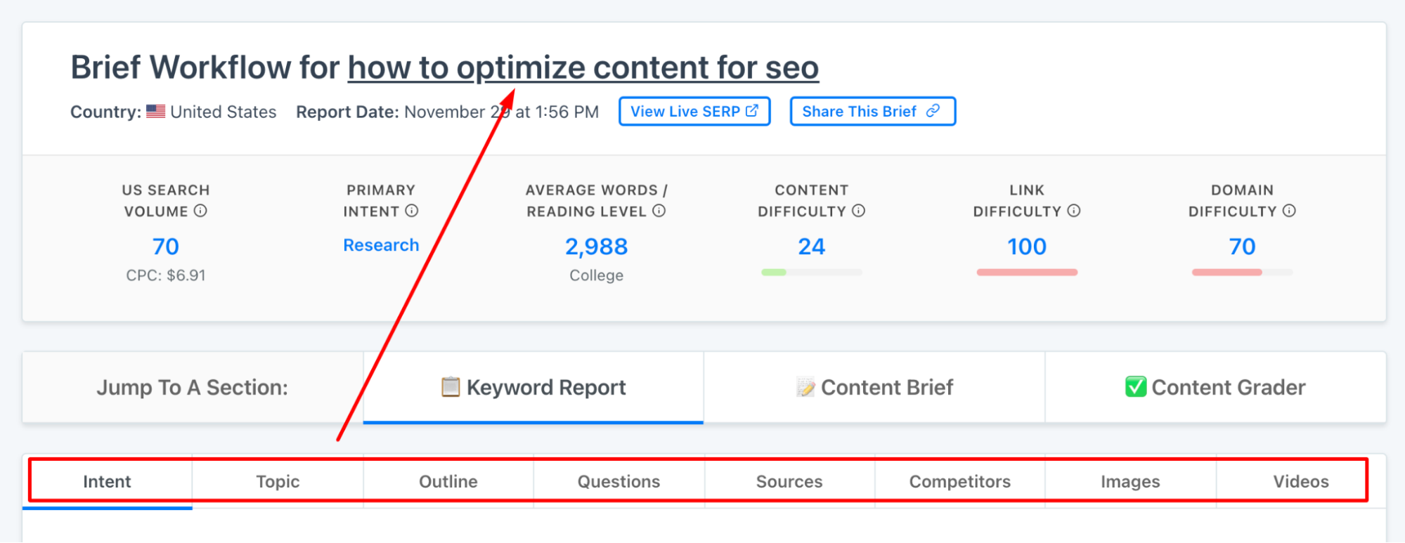 When you run a Keyword Report inside Content Harmony, weโll give you the precise data you need to research a topic before getting started: