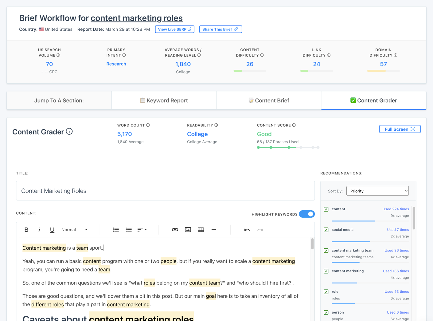 The blog post you just read scores Good in our Content Grader for the topic "content marketing roles".