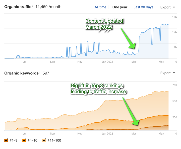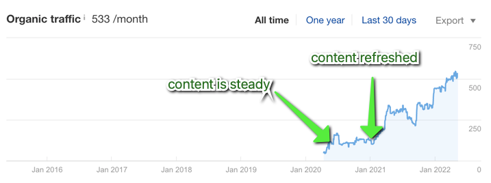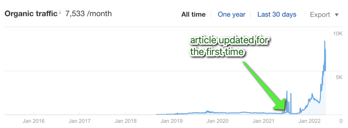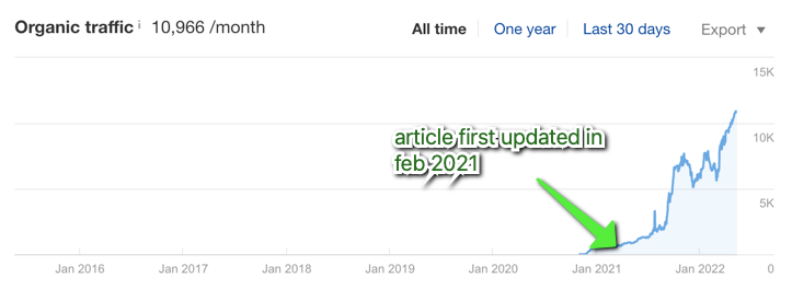 Since that initial drop in traffic, the article has been updated twice. Once in late 2021 and the other in March 2022. It’s safe to say that the updates worked very well — with traffic to the page more than 10X the low witnessed in October 2021.