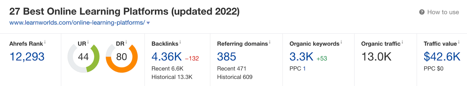 LearnWorld’s “Best Online Learning Platforms” receives 13,000 monthly organic visits, ranks for 3,300 keywords, and has over 4,000 backlinks.