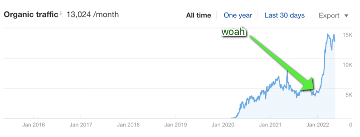 Traffic picked up at the end of 2018 — reaching a high of 3,200 monthly organic visits in Feb 2019 — before plateauing and bouncing around for the next two years.