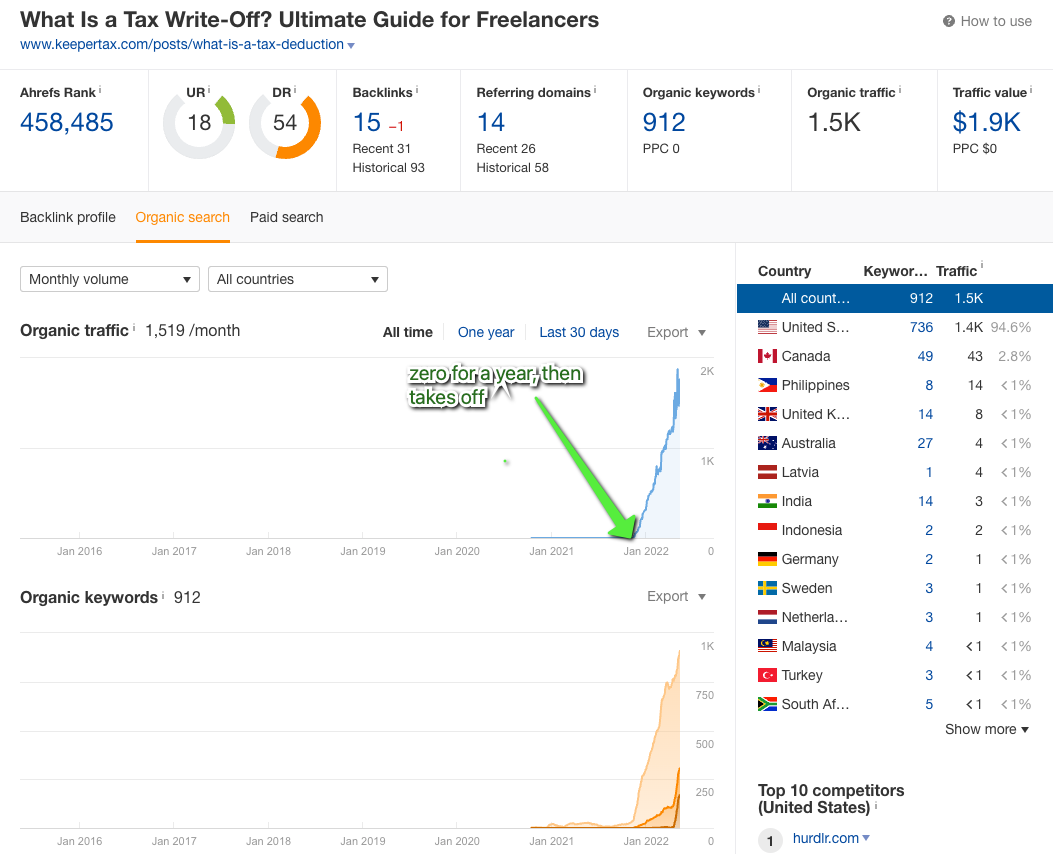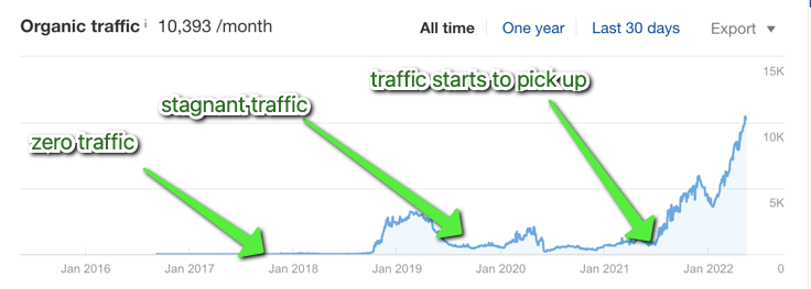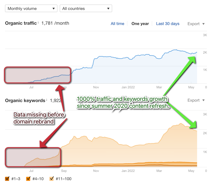 But that wasn’t always the case. First published in 2018, the article languished for a long time on the SERPs — hitting a maximum of 200 estimated monthly organic visitors until its first refresh in mid-2021.