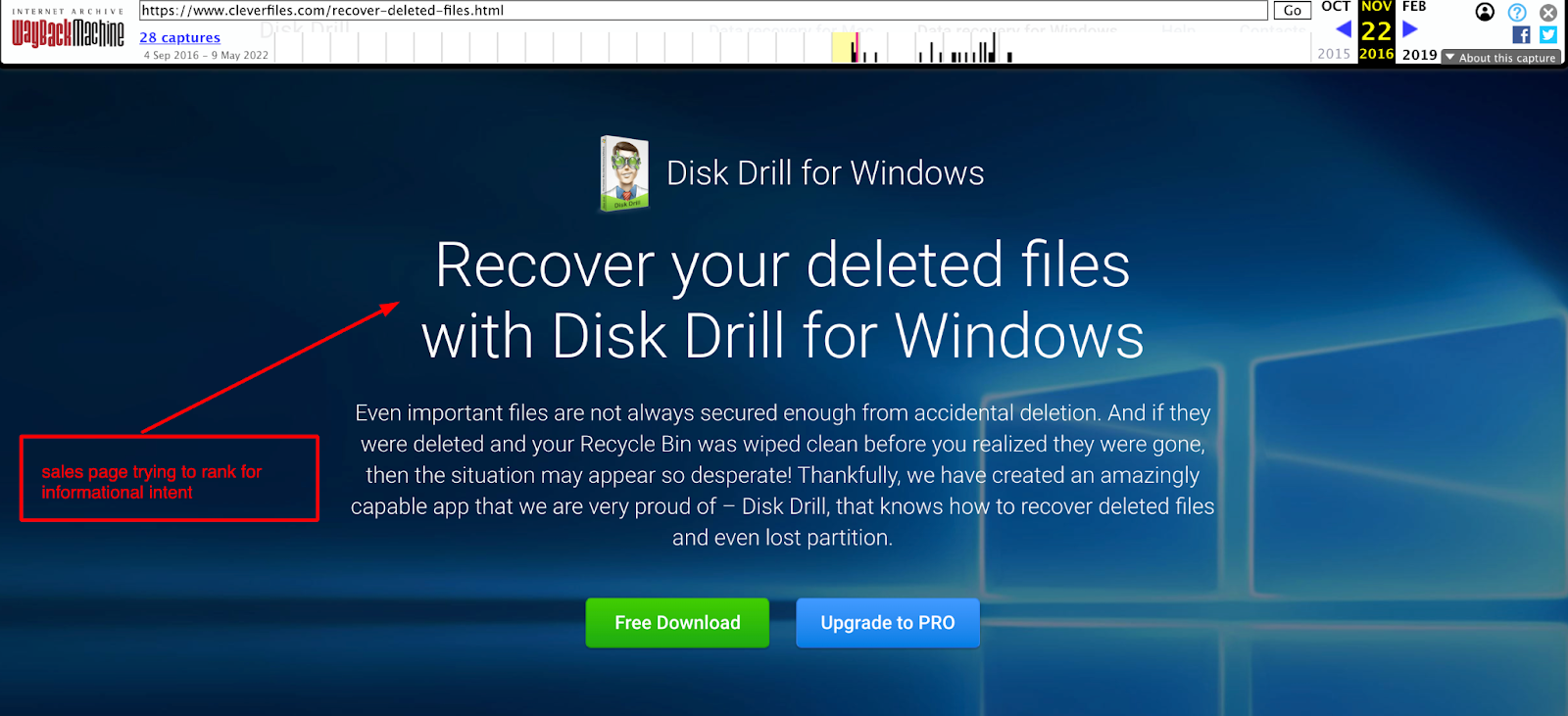 The first version of the post shows that the site was trying to rank for an informational search query (“how to recover deleted files”) with a sales / commercial intent page.
