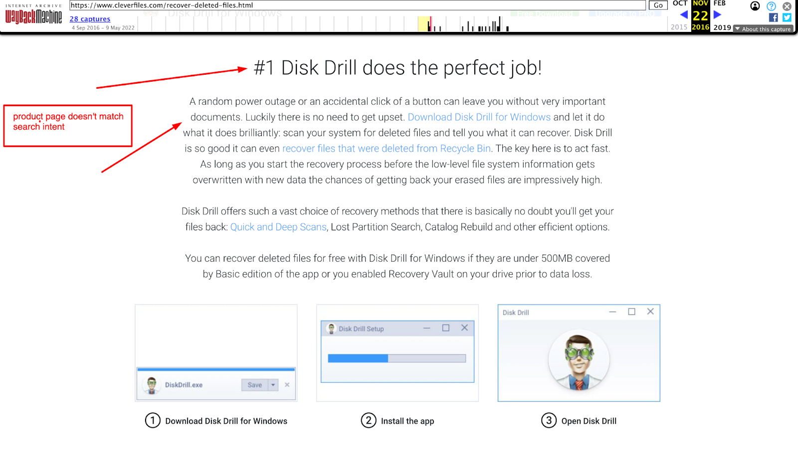 The content below the fold isn’t great, either. The commercial intent is evident, with Disk Drill trying to force its software on readers who might be visiting the page for the first time.