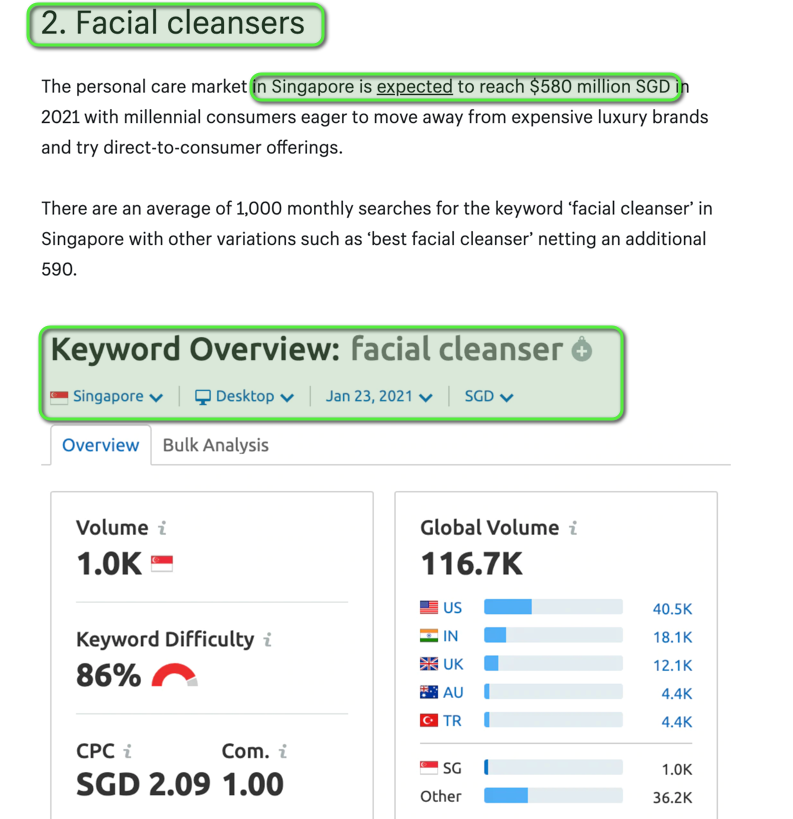 Next, the first H2 also incorporates a related keyword helping it with ranking and indexability. The first product recommendation is boosted by Google trends data that directly references Singapore rather than global trends.