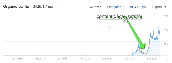 The article — first published in January 2021 — rose up the SERPs pretty quickly, hitting 15,000 monthly organic visits just six months later. But it began to experience content decay; in October it could only draw in 3,000 visitors. That, of course, wasn’t ideal.