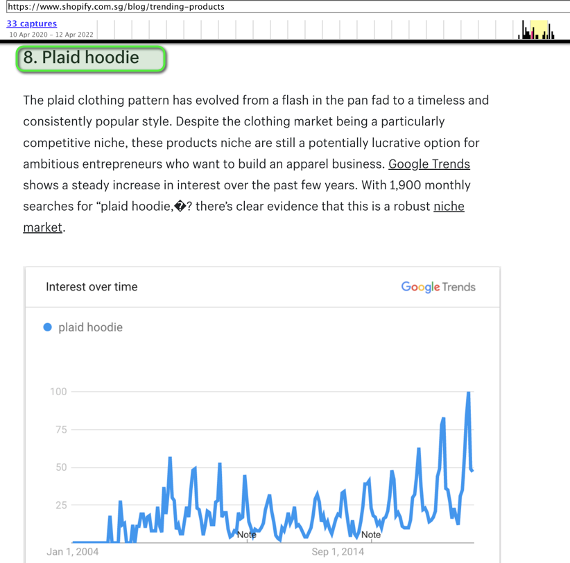 For example, the article recommended “plaid hoodies” as an evergreen item to sell online in Singapore where the average temperature is about 90 degrees Fahrenheit and humidity levels stay consistent at around 70%.