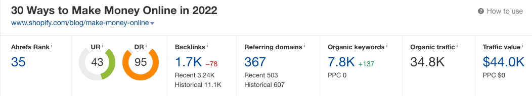 Shopify’s “30 Ways to Make Money Online” receives an incredible 35,000 monthly organic visitors and ranks for nearly 8,000 keywords due to a policy of updating content periodically.