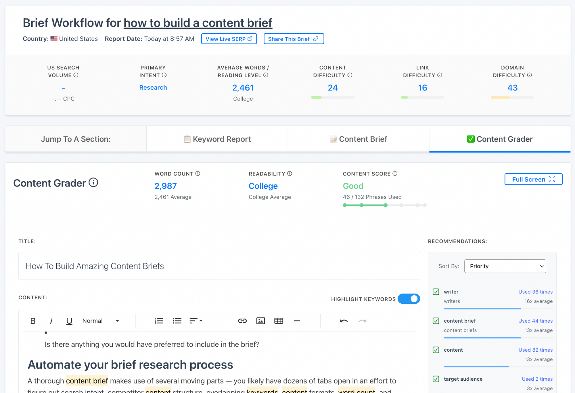 Briefs that normally take 1-2 hours to build can be completed in 10-30 minutes once you optimize the manual steps. That adds up to some pretty substantial cost-savings over the long term, especially if you're an agency or a content team building more than 10 briefs per month.