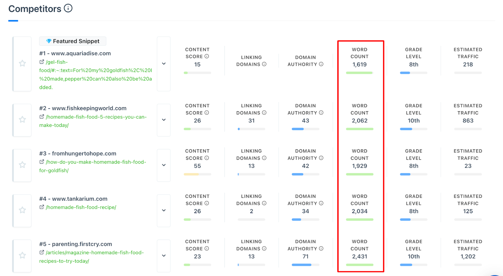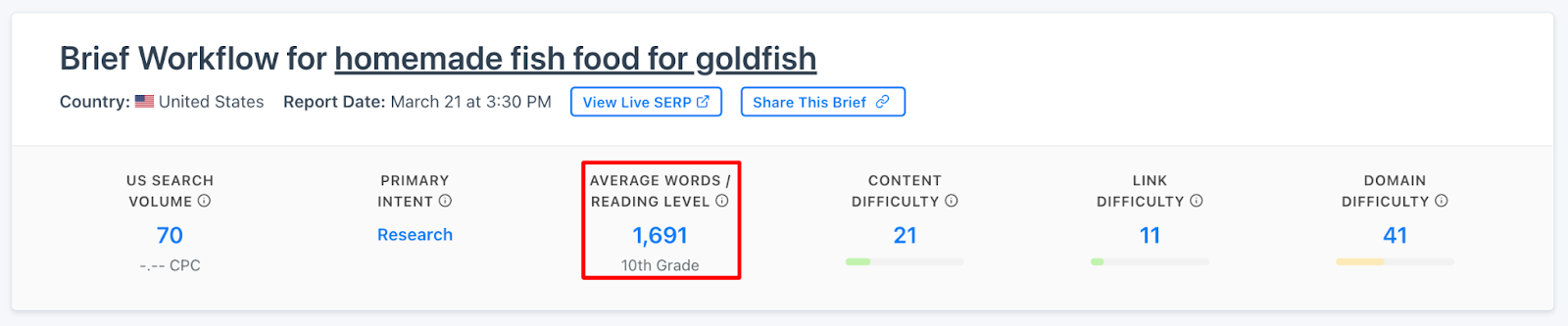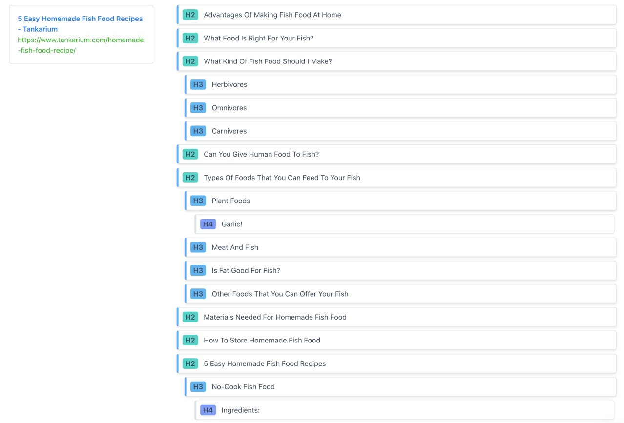 The average word count for the search term “how to make your own fish food” is just shy of 1,800 (this is the average of the top 10 SERP results), but it’s definitely worth digging into further — the aim is to outperform what’s already ranking.