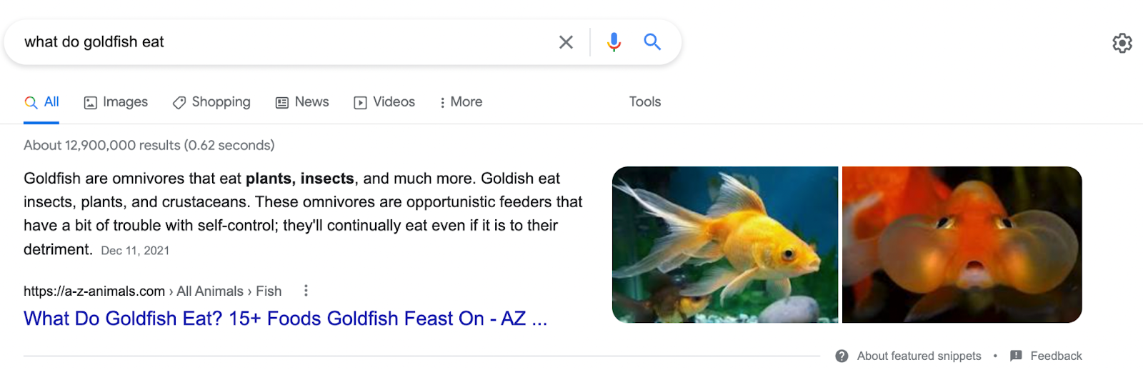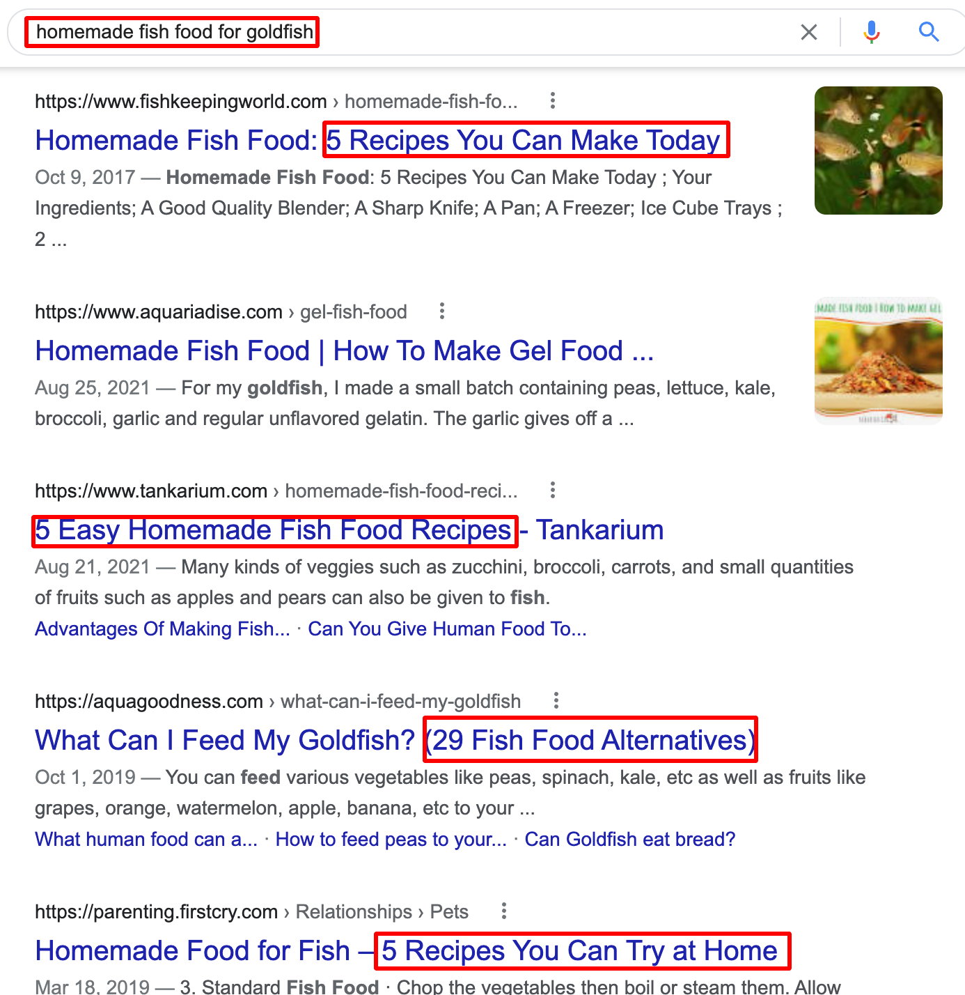 For the purposes of this post, we’re going to assume that you chose the right keyword. If, for example, you tried to rank for “goldfish food” instead, you’ll discover that the intent behind this search query is transactional, not research / informational. Folks are looking for options to purchase food for their fish, not for recipes that they can make themselves.
