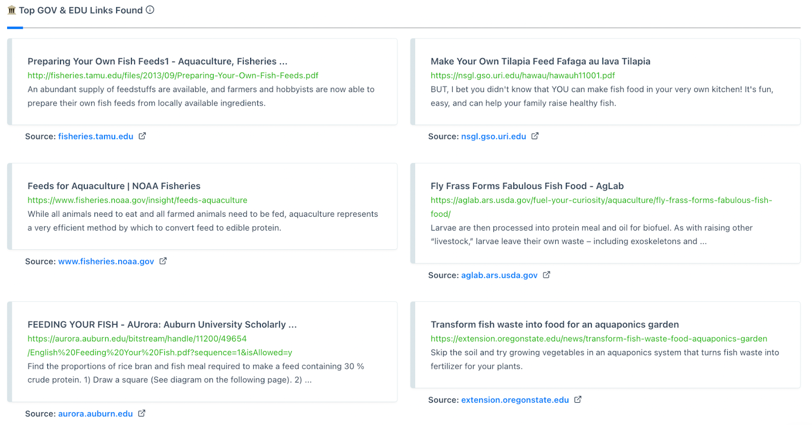 Navigating over to Content Harmony’s ‘Sources’ tab reveals a number of authoritative sources that you could potentially link out to when trying to rank for “how to make your own fish food”.