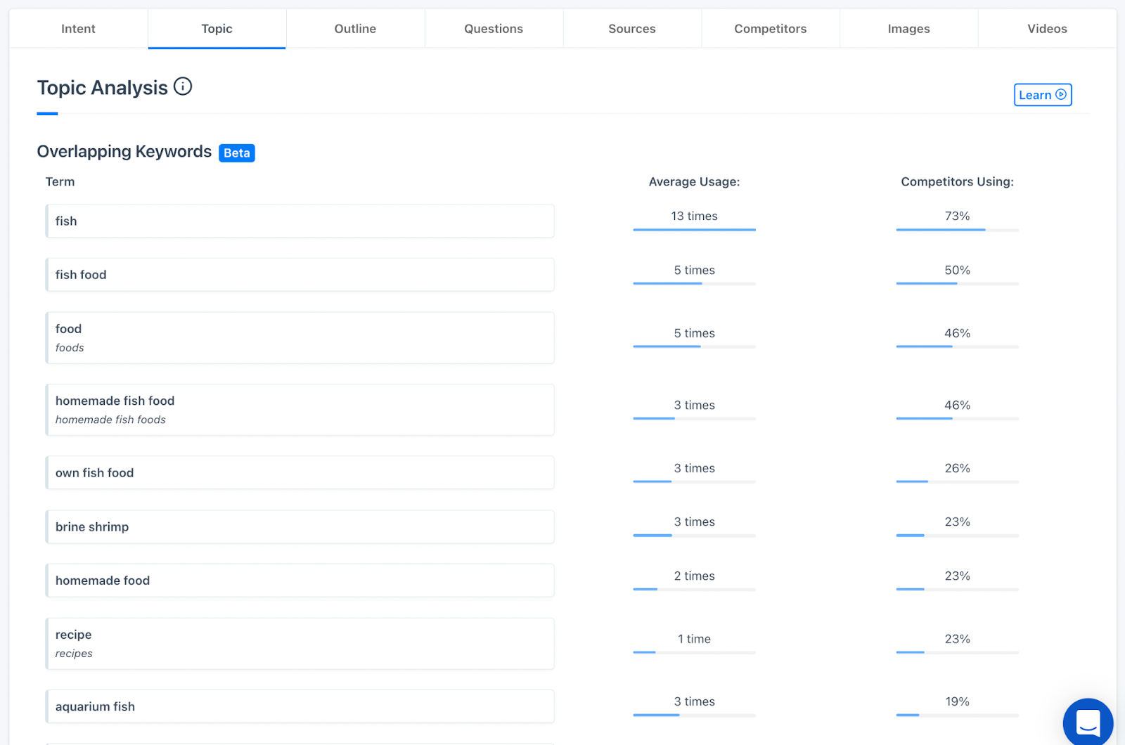 When you’re trying to rank for “how to make your own fish food”, for example, Content Harmony’s topic model uncovers overlapping keywords mentioned by the top 30+ ranking competitors: