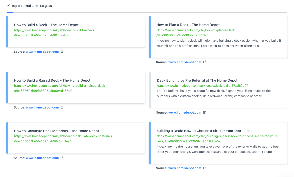 For example, if we ran a keyword report for “how to build a deck” and our client was Home Depot, here’s a list of internal links Content Harmony would help identify: