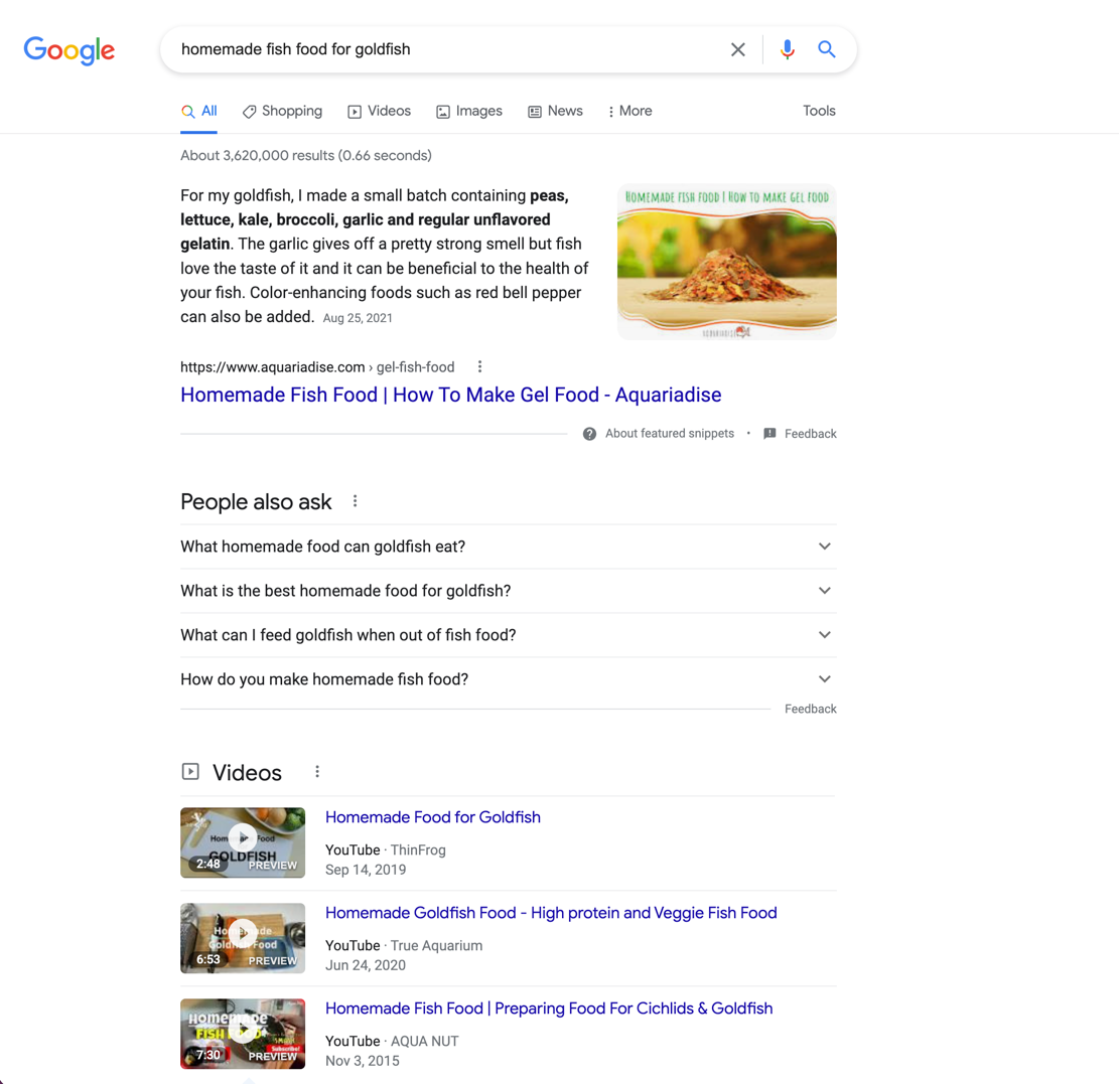 Let’s say we’re trying to rank for the term “homemade fish food for goldfish”. The tone of this search suggests that it is informational — searchers want guidance on how they can feed their pets. But what’s the format that search engines prefer to rank for this query — is it blog posts or something else?