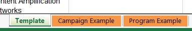 Our downloadable Excel file comes with a few tabs. You get a blank template, but also some examples of how youโd complete this channel plan both for an ongoing program and for a single campaign.
