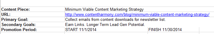 Our primary goal for this piece of content is to add subscribers to our newsletter list. Our secondary goal is to earn links and generate long-term leads. Promotion would take place during November.
