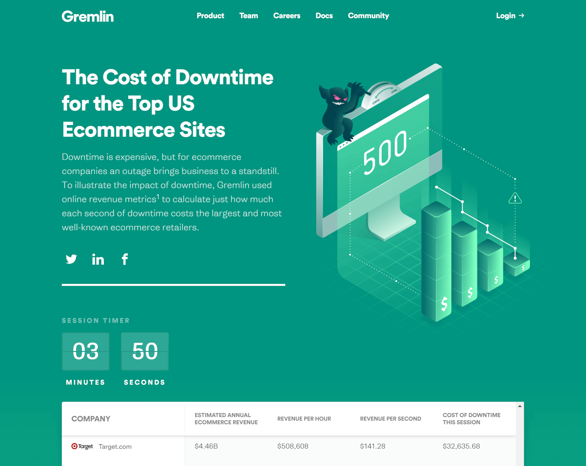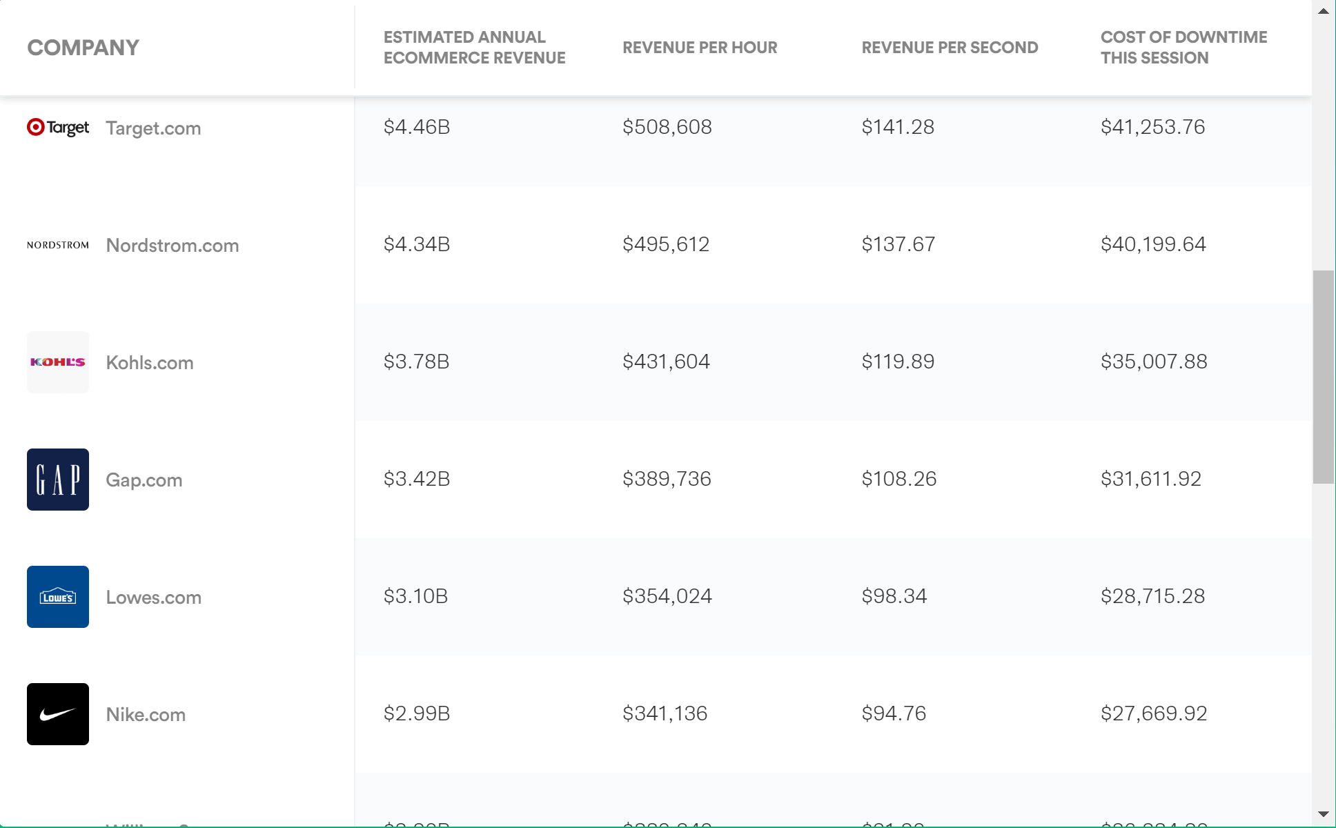 Gremlin is a tool that helps companies prevent downtime by randomly attempting to break things on their site (it’s called Chaos Engineering). So it’s fitting that they released this “Cost of eCommerce Downtime” data analysis to estimate how much money large online retailers are losing when their websites are down, based upon their estimated revenue per year, hour, and second.