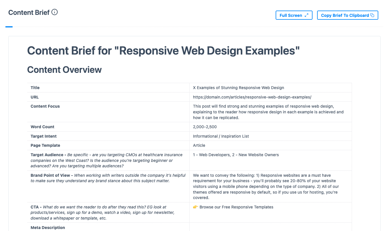 We give you multiple preset content brief sections that you can fill out, in order of importance. Fill in a few of them or all of them โ the more information you can give to writers or clients, the better.โ