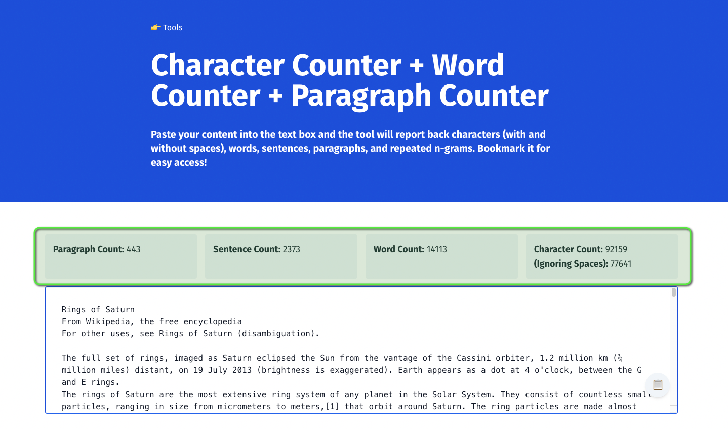 Paste your content into the text box and the tool will report back characters (with and without spaces), words, and paragraphs. Bookmark it for easy access!