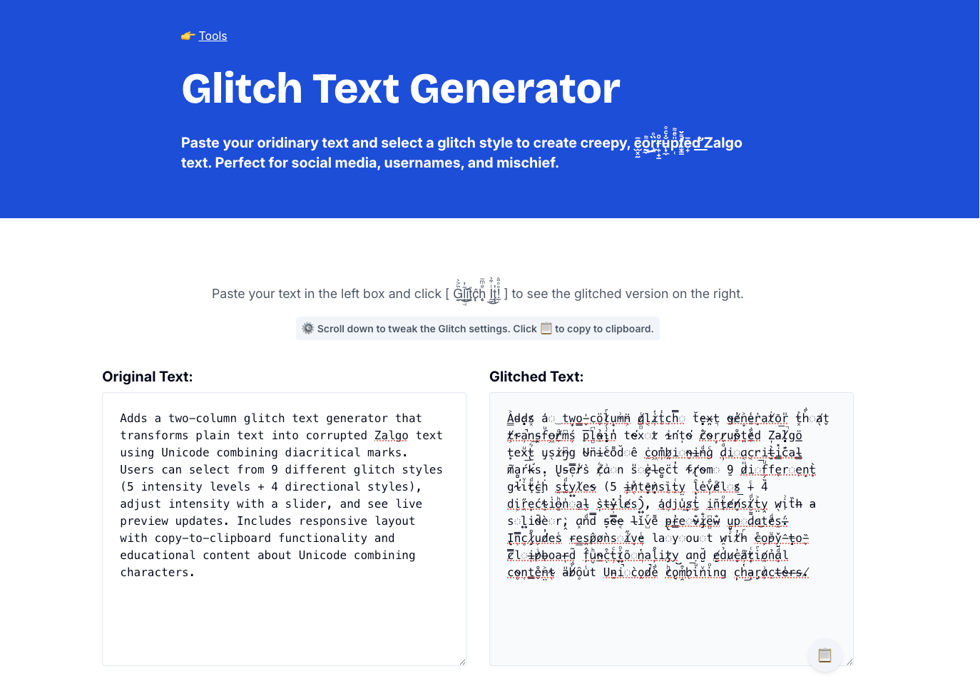 Paste your oridinary text and select a glitch style to create creepy, cฬฬถฬซอฬฐoออฬฐฬผrฬฬฬฬกrอฆฬตฬฬฬฒuฬอจฬฬตอฬขฬผpฬอคอฬtอฬฬธฬฎอ ฬณeฬ ฬถฬdฬอออ Zalgo text. Perfect for social media, usernames, app testing, and mischief.