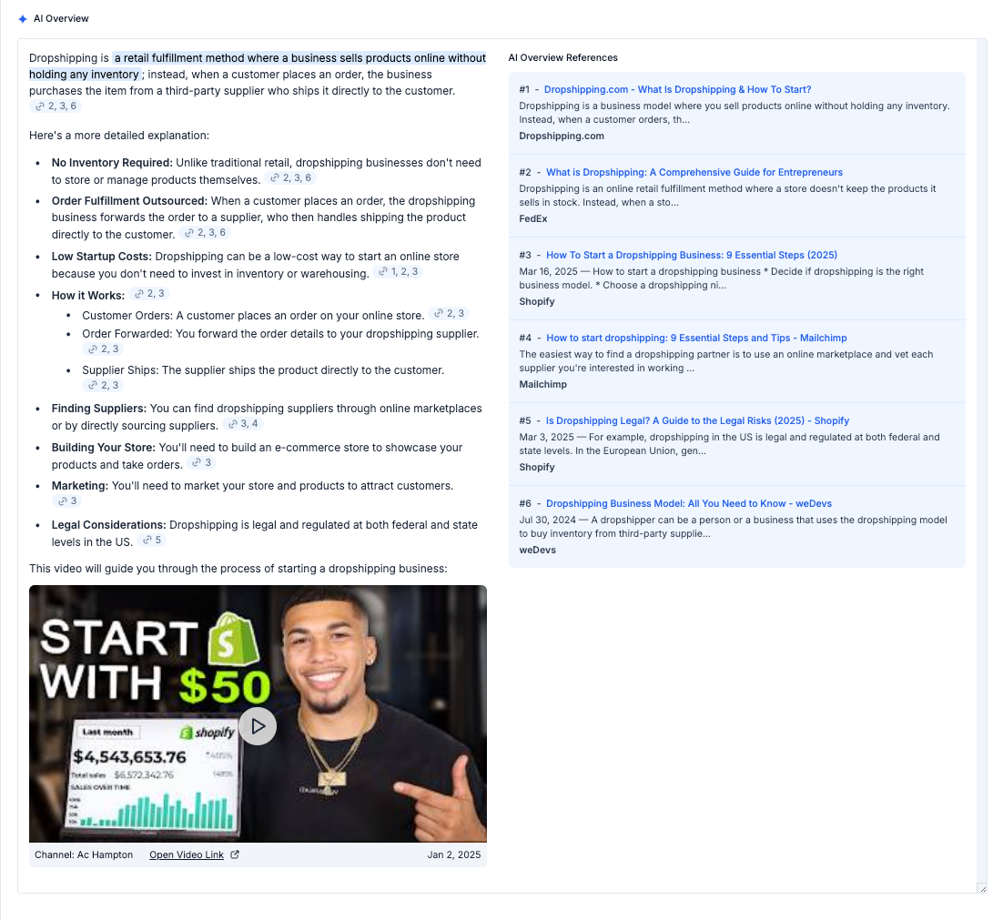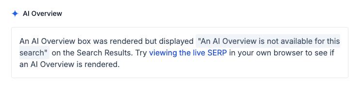 Sometimes Google doesn't display AI Overviews correctly due to various LLM errors. When that happens, we'll still let you know that Google tried to display an AI Overview and that you should take a look in your own browser.
