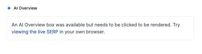 It's also common for Google to offer an AI Overview but require further user interaction before displaying it. In that case we'll display a similar message prompting the user to go take a look in their own browser.