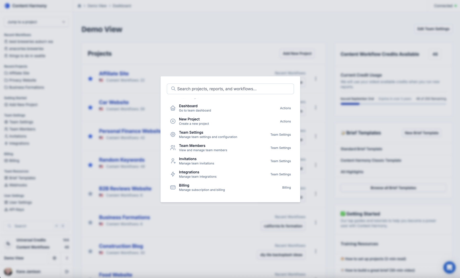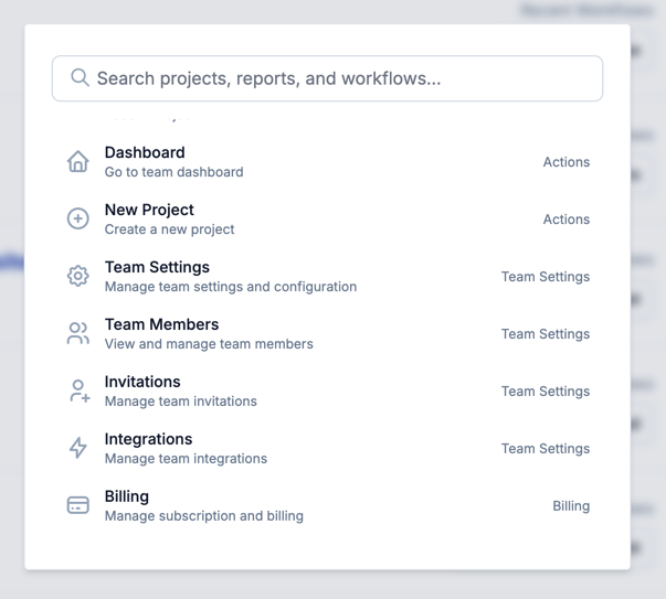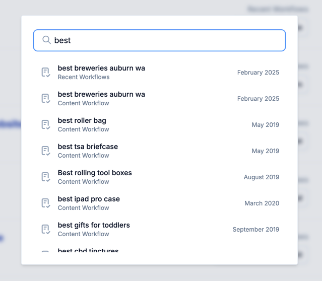 From there you can navigate common jumplinks with your up/down keyboard strokes, or search across all of your Projects, Content Workflows, and Promotion Workflows.