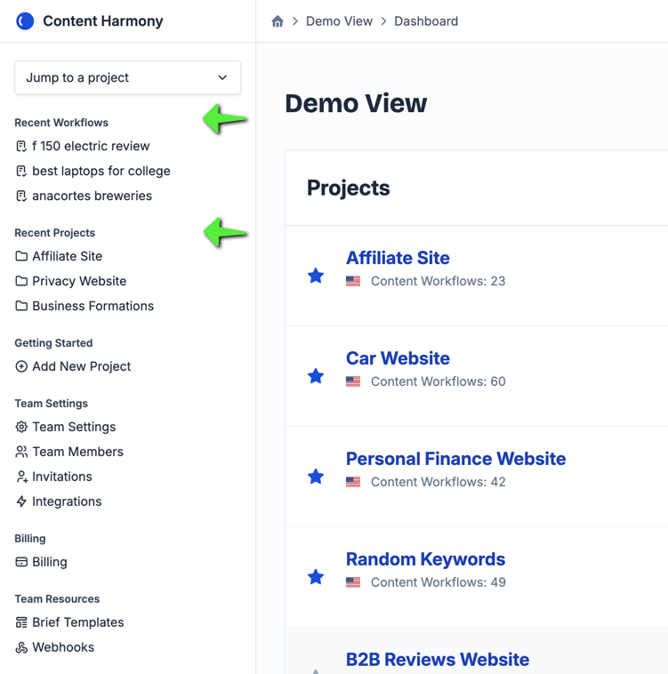 Additionally, we've launched quick short cut links on the team dashboard to your three most recent Workflows and your three most recent Projects: