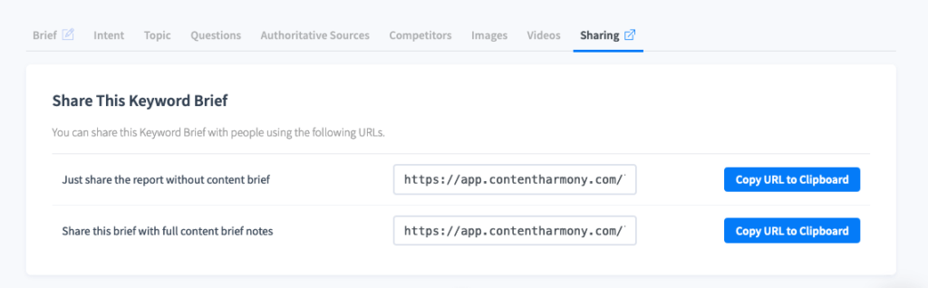 Just click on the Sharing tab in your brief, and you can choose to share with content brief notes, or just share the keyword brief data without internal notes:โ