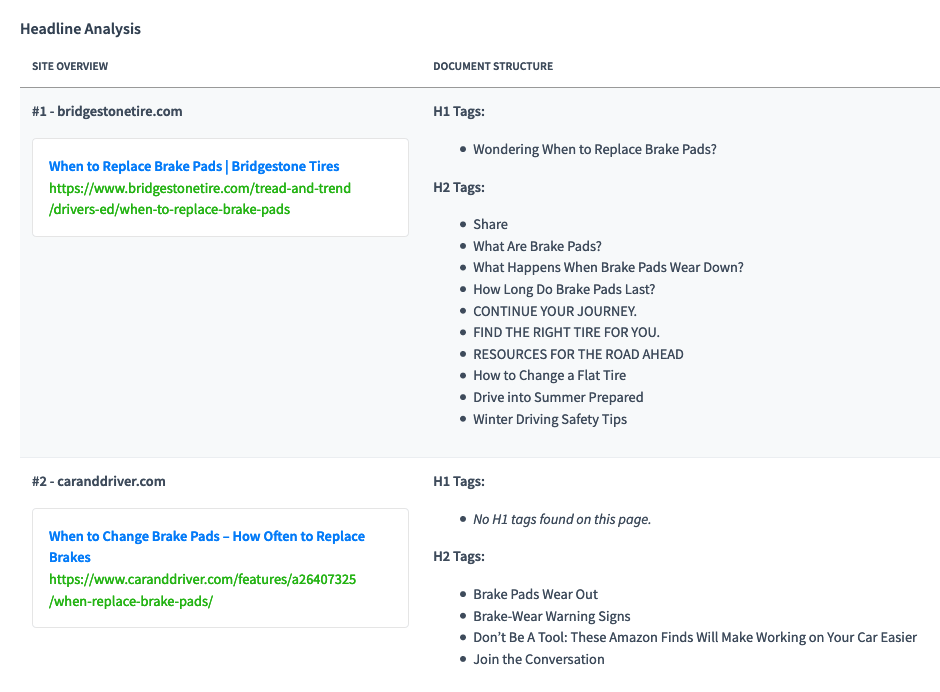 You can now see H1/H2 structure of competitors at a glance at the bottom of the topics tab. Now you can scan all of a competitors headlines at once to help brainstorm your own document outline. This is version 0.1 and weโd like to hear ways to improve it.