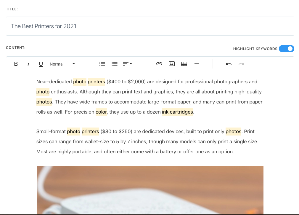 As of today you can now see keywords highlighted in our Content Grader as you type: