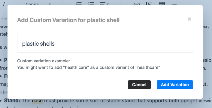 In the example below, we suggest using the phrase "plastic shell", and the user is adding a custom variation for "plastic shells" to match the syntax they used inside of their draft.