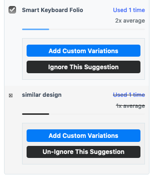 The first is that you can add custom variants to any of our suggested phrases to accommodate things like your brand's style requirements, or variations we may not have seen competitors using based upon capitalization, pluralization, etc.