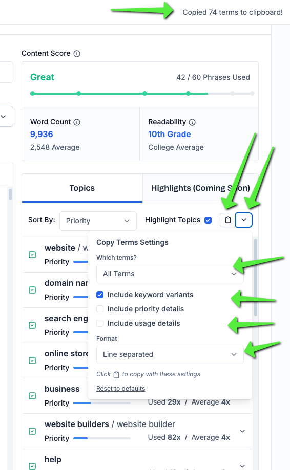By default, we will export All Keywords and Keyword Variants to your clipboard. If you'd like, you can also export Priority details (eg 87% priority) and usage details (eg currently used 15x (avg 12x) ).