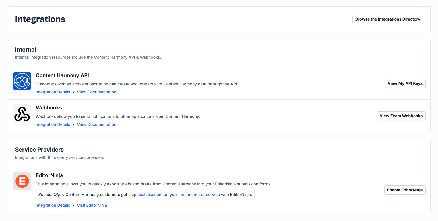 Teams can enable the integration themselves on the new Team Integrations page at https://app.contentharmony.com/account/integrations, as well as get access to a signup bonus offer to give EditorNinja a try.