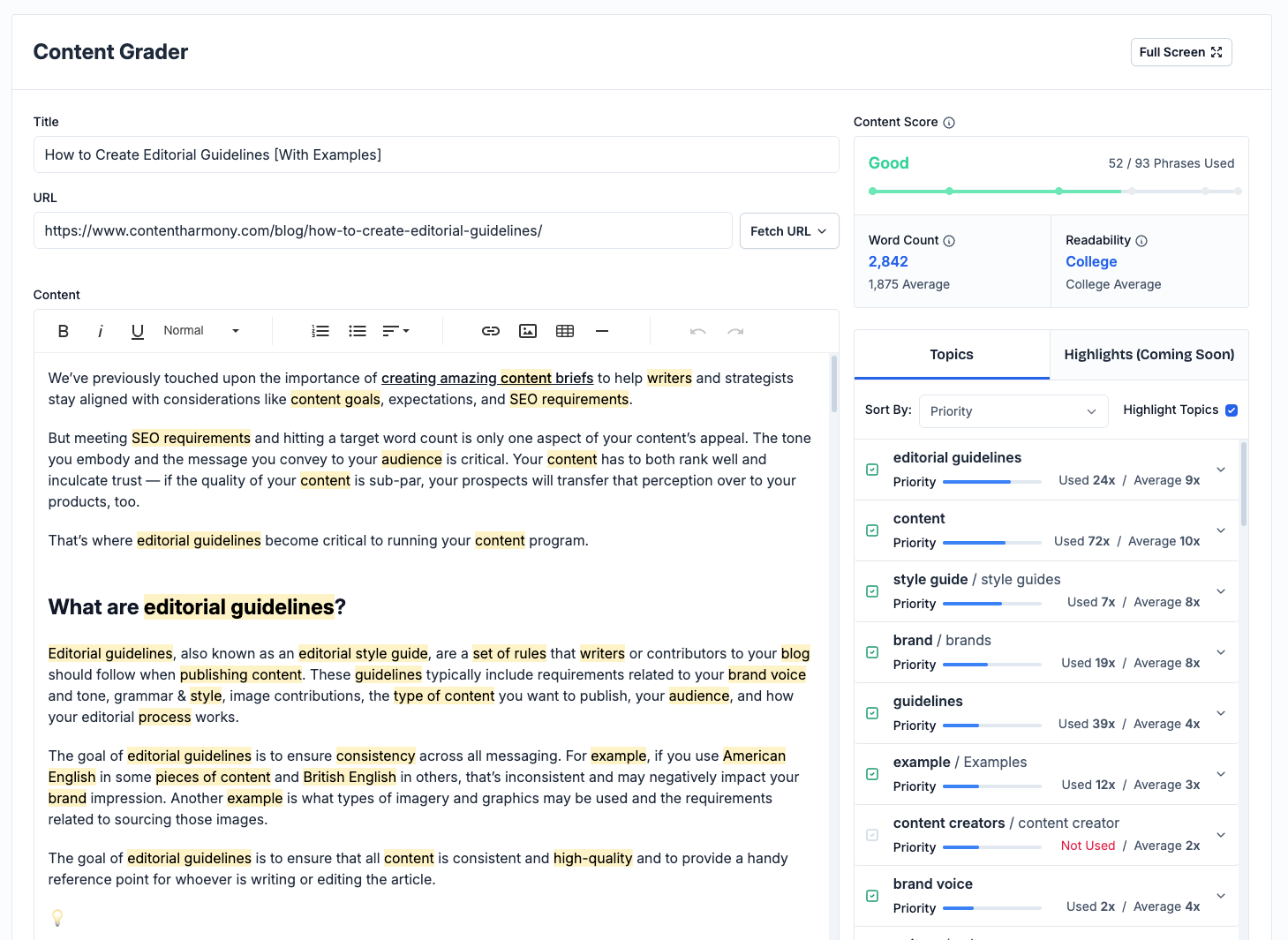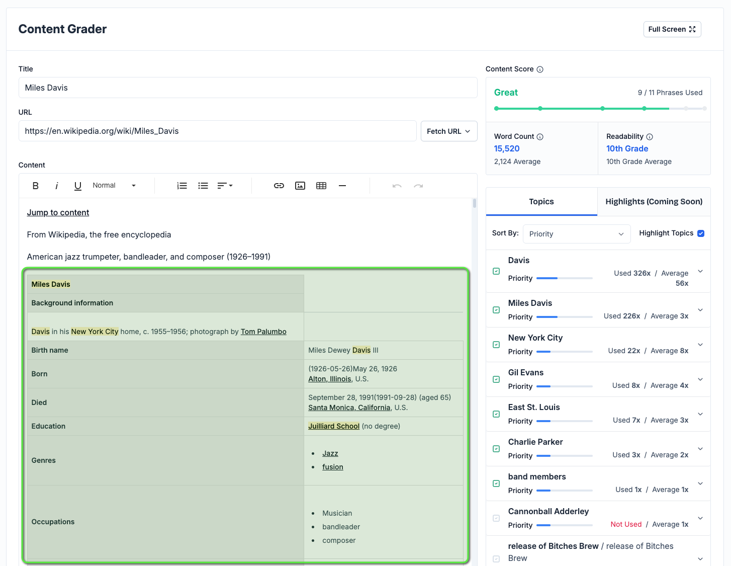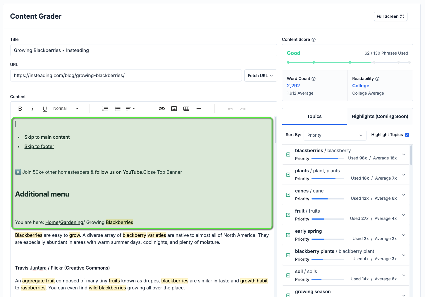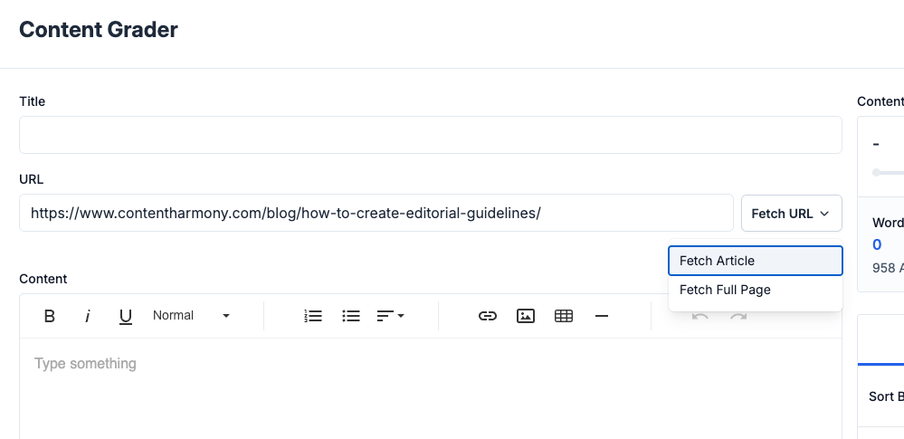 Paste a published URL into our new Content Grader field, select Fetch Article or Fetch Full Page from the dropdown button, and we'll go off and fetch the live content of that URL.